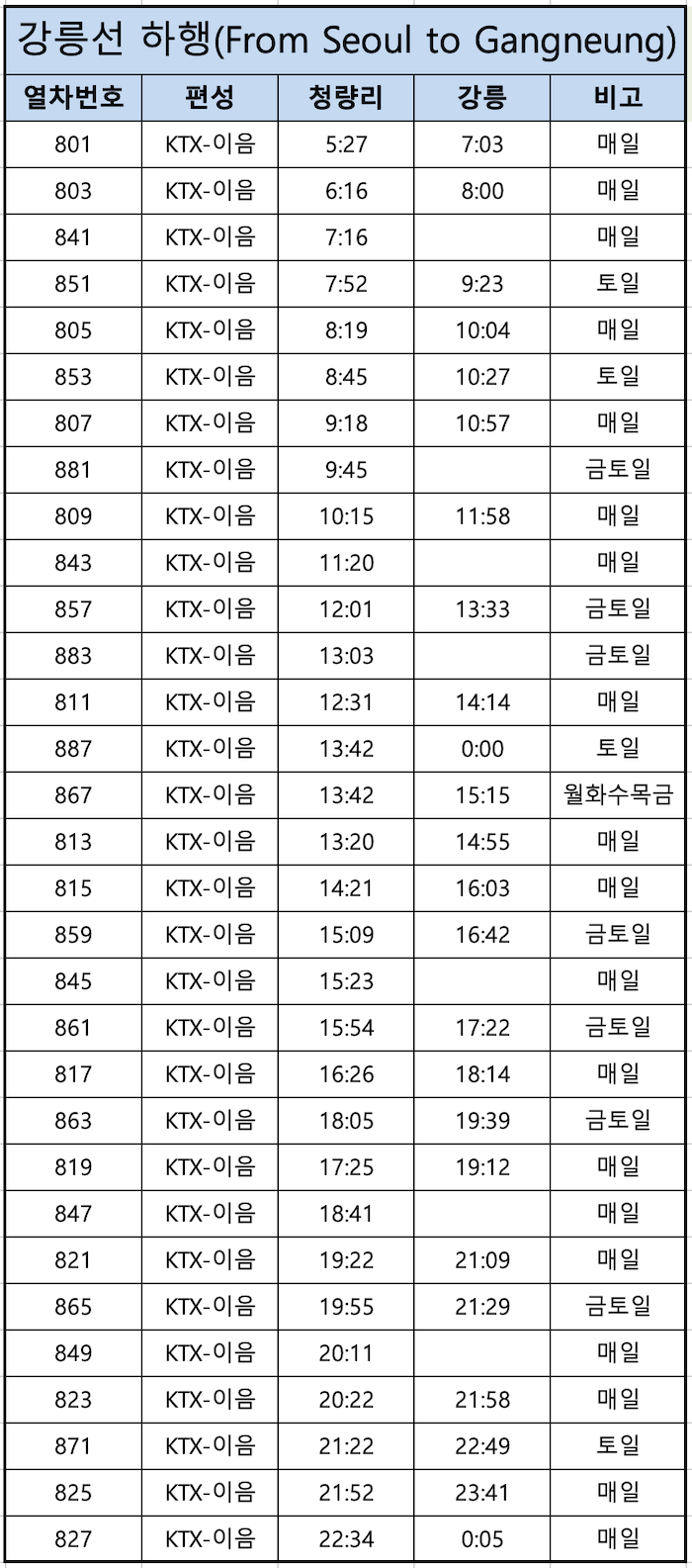 • 다양한 시간대 KTX‑이음이 청량리역을 출발해 강릉 쪽으로 운행됩니다. - 청량리 → 부전 / 울산 노선