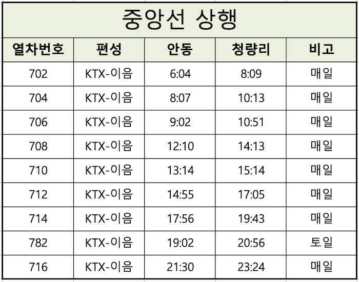 • 청량리발 KTX‑이음은 중앙선 및 강릉선 노선 위주로 정차하며, 상행/하행 모두 노선별로 정차역이 다릅니다.