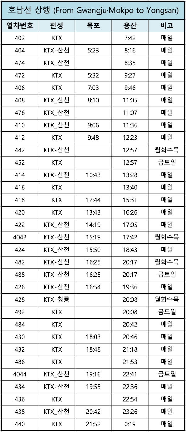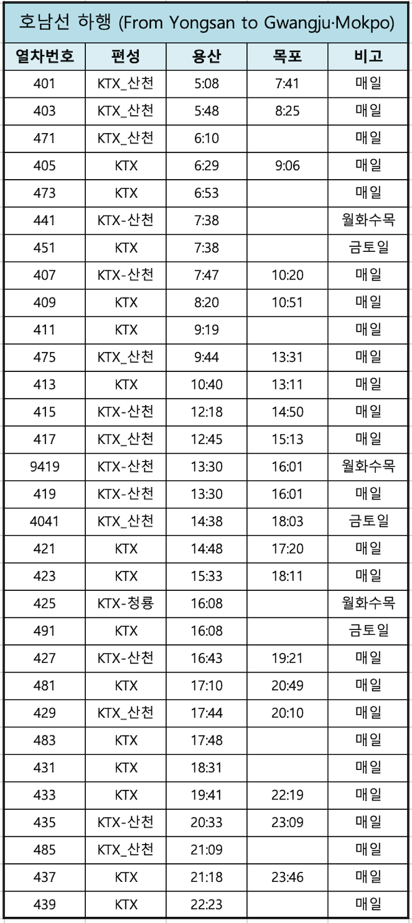 여행 또는 업무 목적으로 전라권 이동을 계획 중이라면, 용산역에서 출발하는 KTX 편을 확인하여 편리하게 이용하시기 바랍니다.