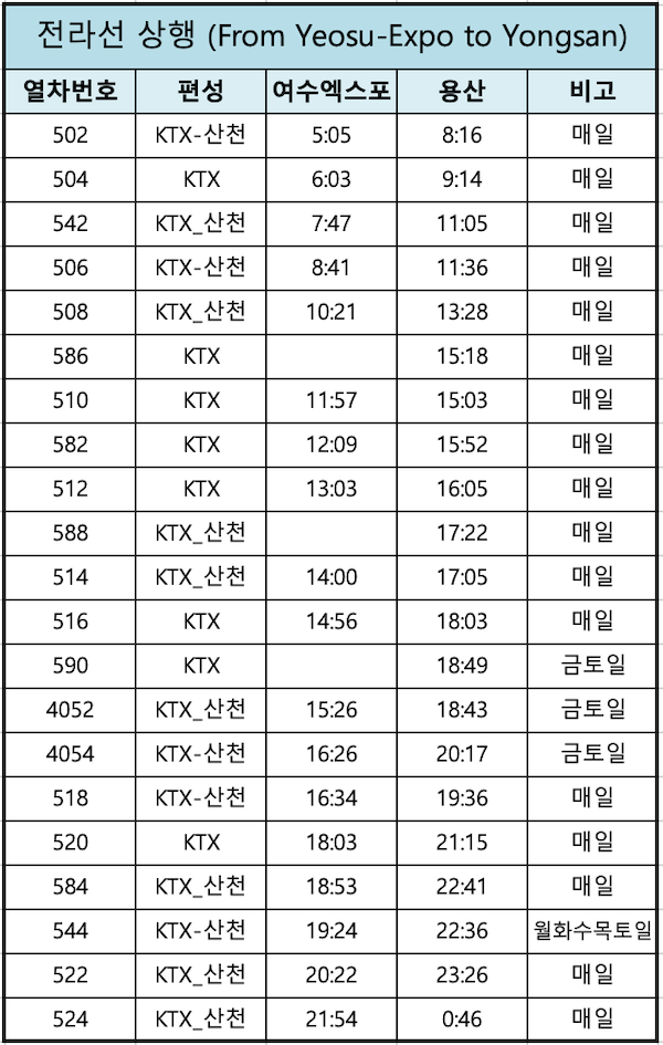 약 2시간 30분 소요, 중간 정차역: 천안아산, 서대전, 논산, 정읍 등 - 용산 ↔ 전주 ↔ 남원 ↔ 여수엑스포 (전라선)