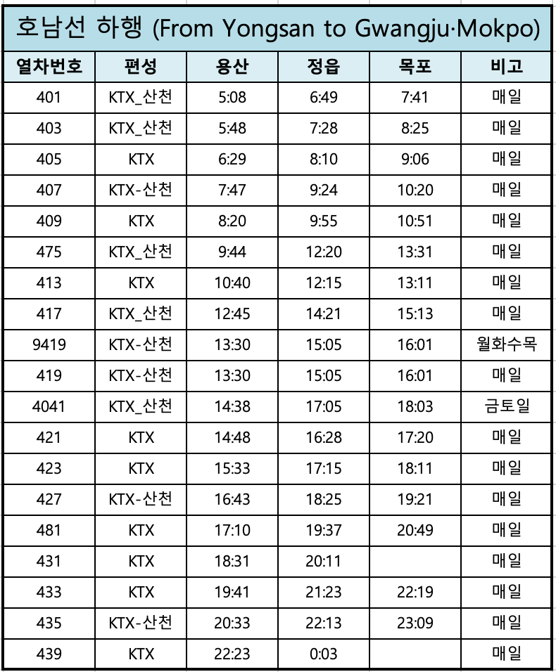 • 시간표는 요일, 열차 등급(일반 KTX vs KTX‑산천), 노선(호남선/전라선) 등에 따라 다르게 적용됩니다.
