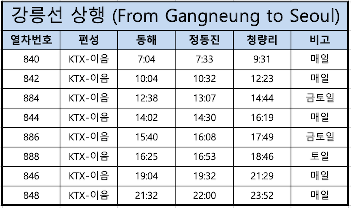 • 또한 정동진 ↔ 청량리/서울 방향 첫차 막차 정보가 존재합니다. 예: 첫차 오전 7:33, 막차 오후 22:00 기준. - 유의사항