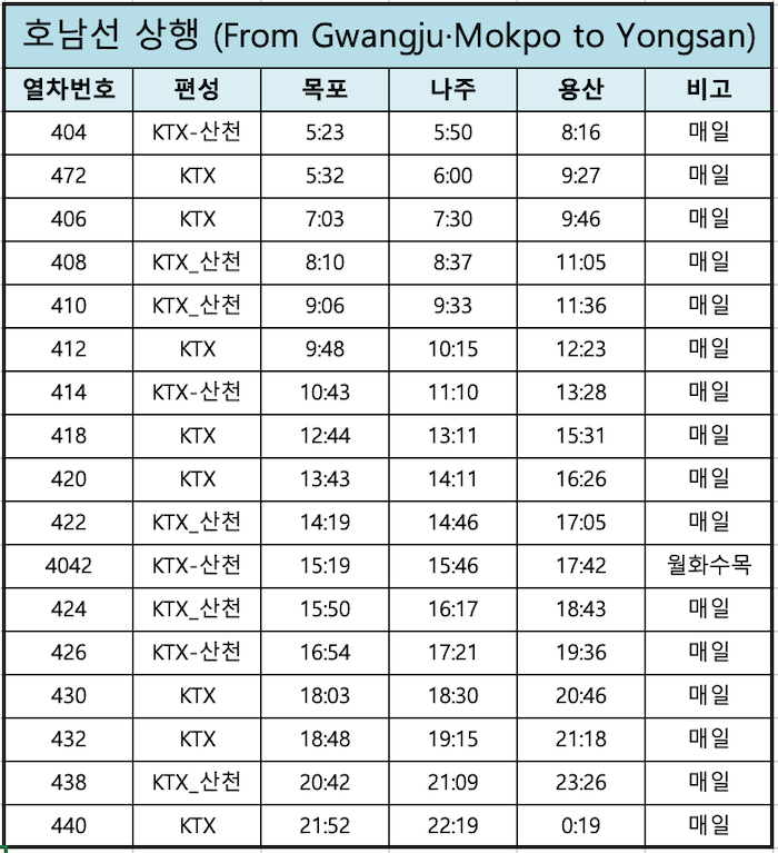 - 시간대·요일·열차 등급(일반실·특실) 등에 따라 정차역 및 소요시간이 달라질 수 있습니다.