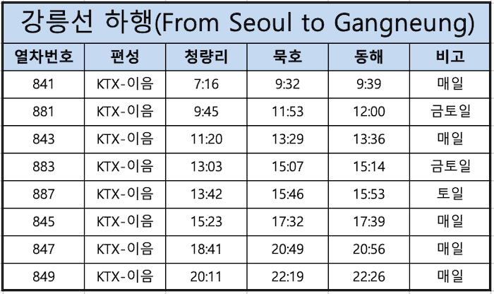 강릉선 KTX 청량리→동해 하행 시간표