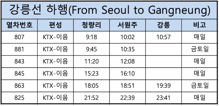 강릉선 KTX 청량리→강릉 하행 시간표