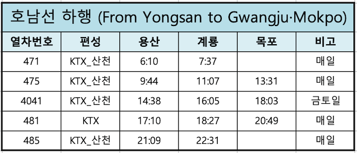 호남선 KTX 용산→목포 하행 시간표