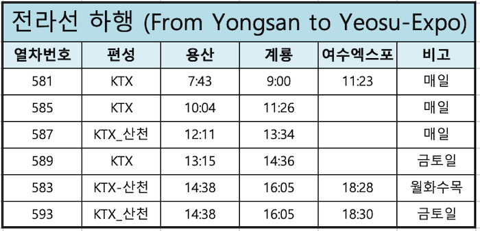 전라선 KTX 용산→여수엑스포 하행 시간표