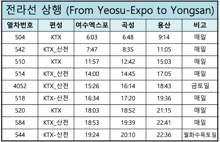 전라선 KTX 여수엑스포→용산 상행 시간표