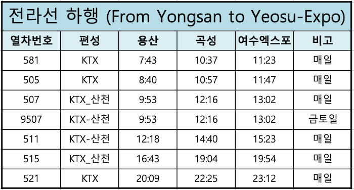 전라선 KTX 용산→여수엑스포 하행 시간표
