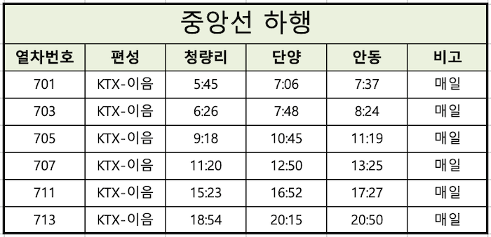 ※ 시간표·횟수는 성수기, 공사계획 등에 따라 변동됩니다. 출발 직전 레츠코레일(웹) 또는 코레일톡(앱)으로 실시간 조회·예매하세요.